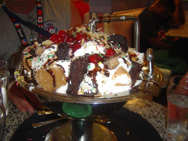 Más de 20 bolas de helado de vainilla, chocolate, fresa, café, y menta con todos los condimentos de la cocina y un bote entero de nata montada. Postre para un mínimo de 4 personas, digno de ver…